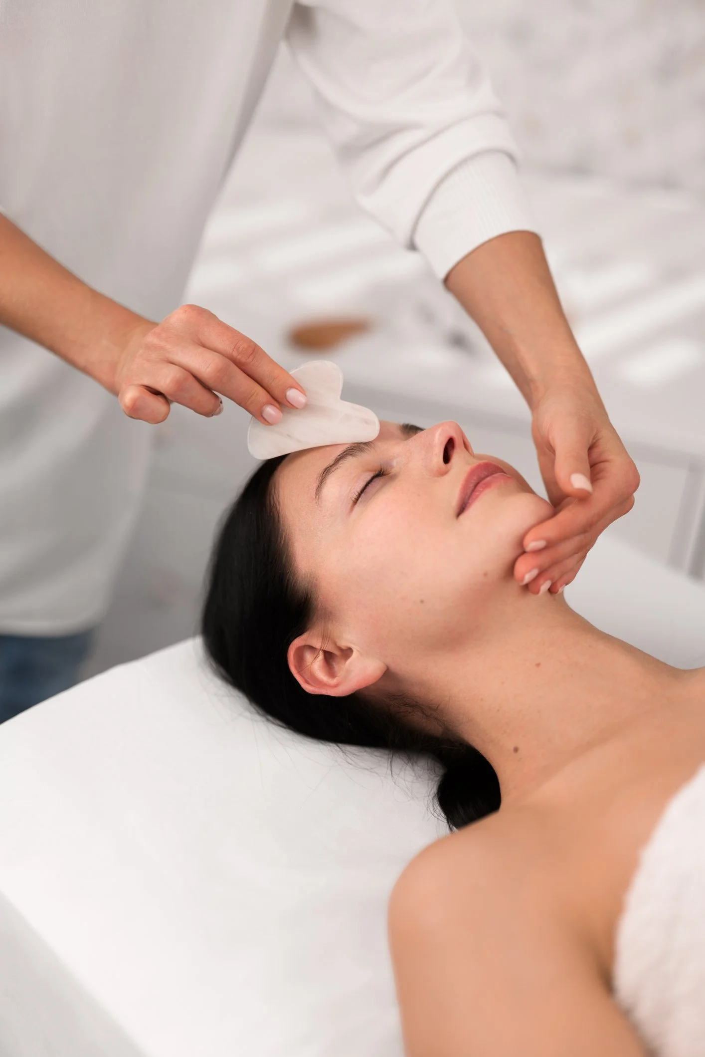 Lymphatic drainage face massage with gua sha is a gentle, yet highly effective treatment designed to stimulate the lymphatic system, reduce puffiness, enhance circulation, and promote a sculpted, radiant complexion. This technique combines manual lymphatic drainage (MLD) with the practice of gua sha, using a smooth edged tool to massage the face along the lymphatic pathways.